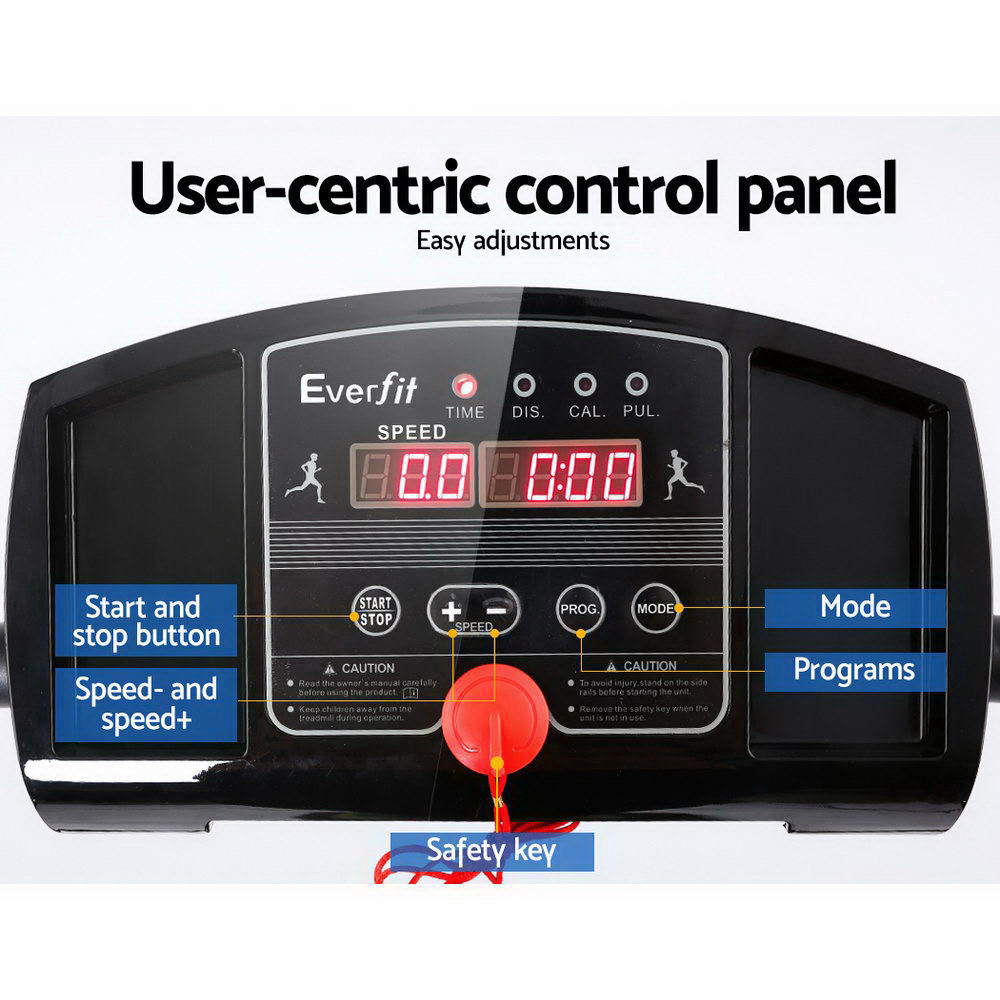 Compact and sturdy with its powder-coated steel frame, the Everfit Electric Treadmill allows you to perform essential cardio exercises within the comfort of your home. It features 12 pre-set training programs designed to simulate natural terrain. A user-centric control panel with a digital LED display lets you set up to 12 speed levels and other monitoring parameters. Its linear power drive motor produces smooth and seamless operation and the anti-slip belt and soft-grip handle bar with pulse sensors make your session a comfortable and controlled experience. Other great features include safety tether key and smooth wheels for easy mobility.